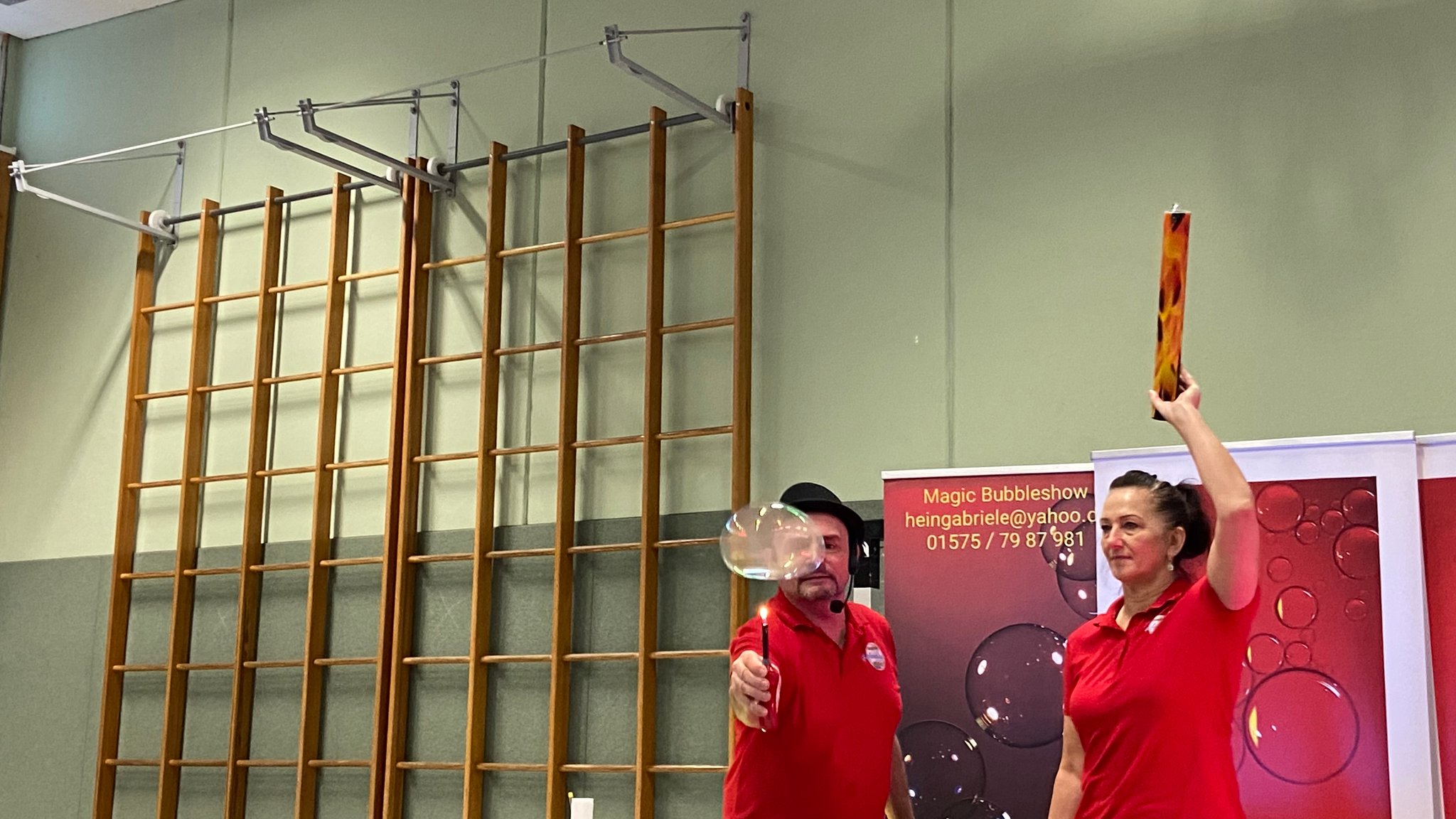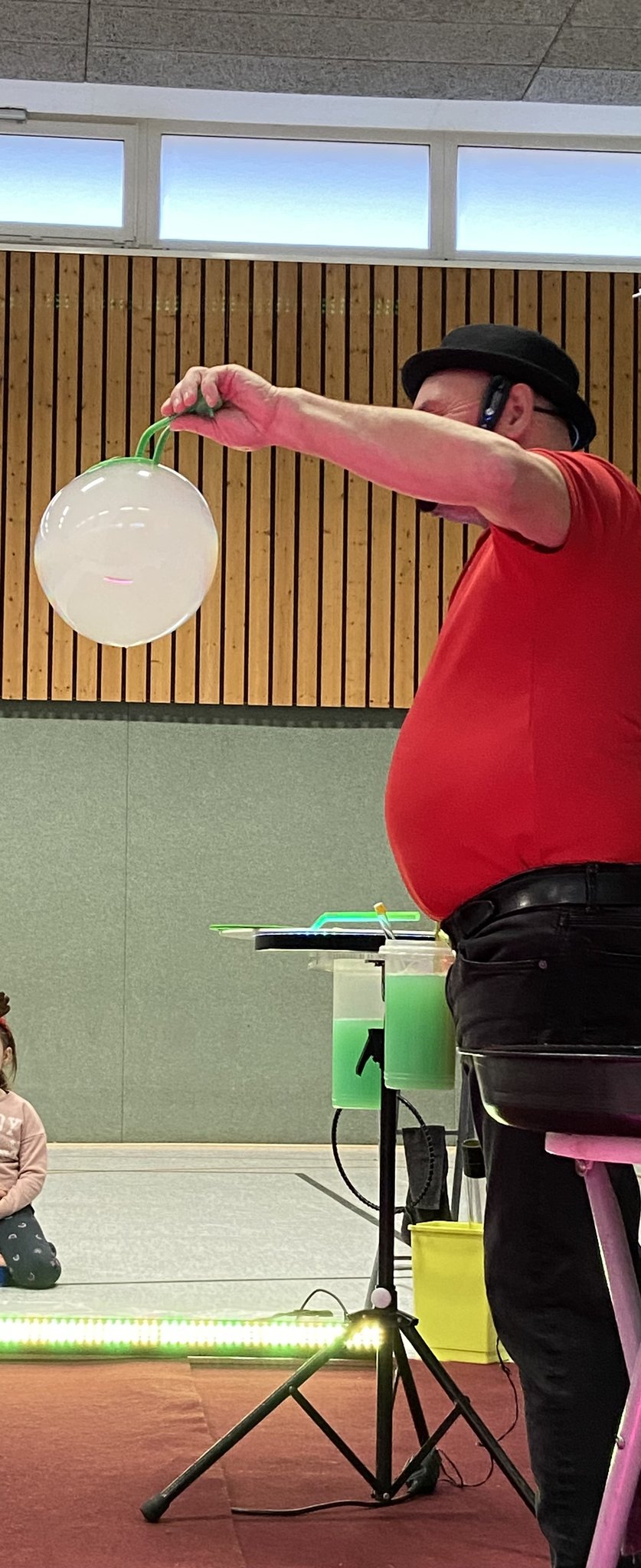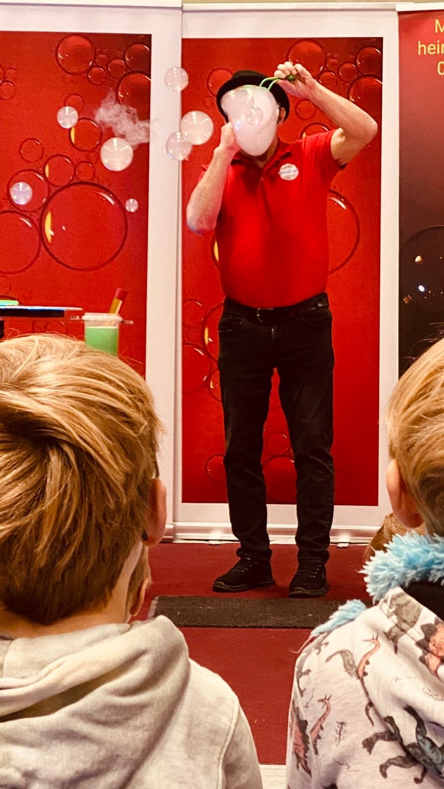 Der Tag begann um 8.00 Uhr für die Jahrgänge 1+3 in der Turnhalle. Dort erwartete sie bereits eine kleine "Bühne" mit zwei wunderbaren Künstlern. Die Schüler saßen im Halbkreis ganz dicht an der Bühne und konnten die Show genießen. Und wer dachte, Seifenblasen können nur durch den Raum schweben, wurde eines Besseren belehrt. Wir haben ein Seifenblasen-Karussel, brennende Seifenbladen, eckige Seifenblasen, einen Vulkan und vieles mehr gesehen. Es war eine ganz großartige Veranstaltung und wir danken dem Team von Gabriele Hein für die "Magic Bubble Show". Zum Schluss durften alle Freiwilligen auch in ein eine große Seifenblase steigen.