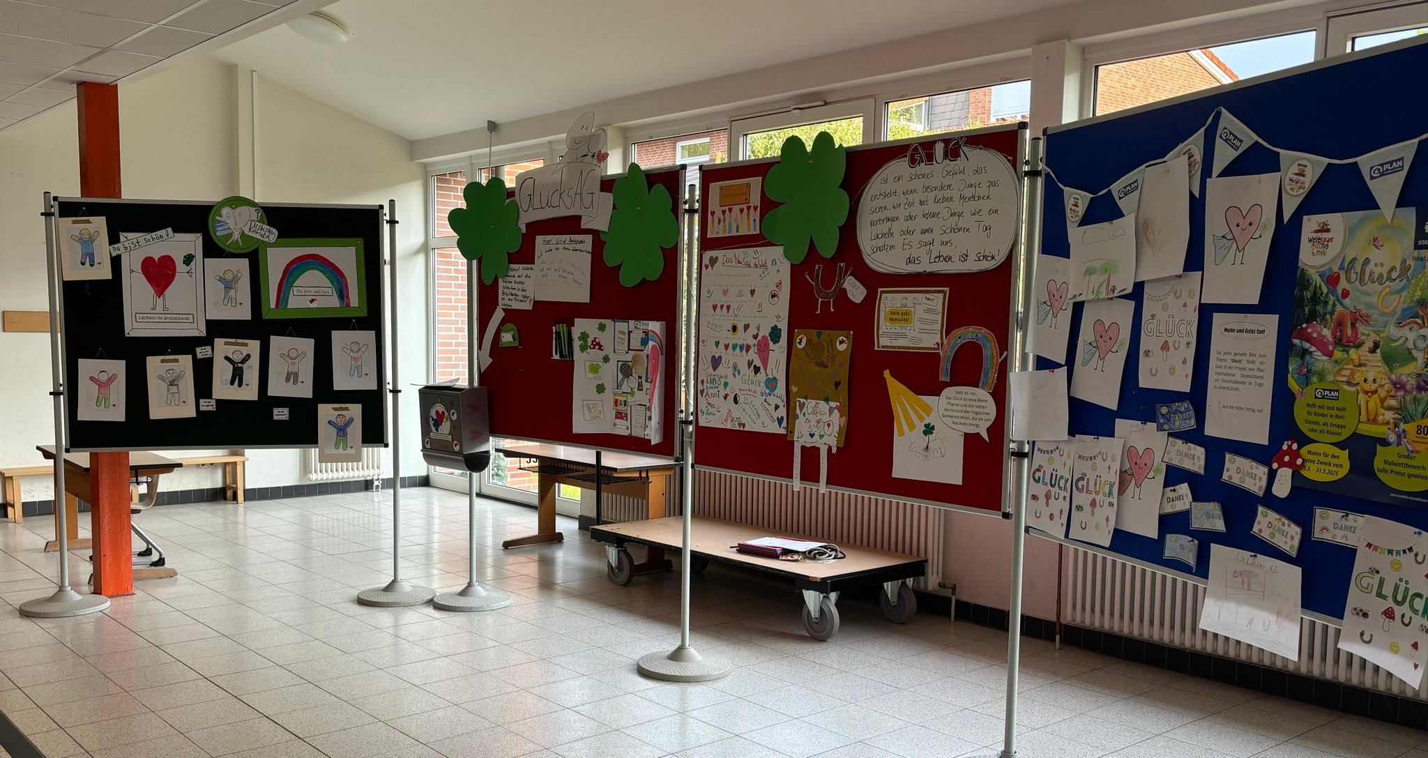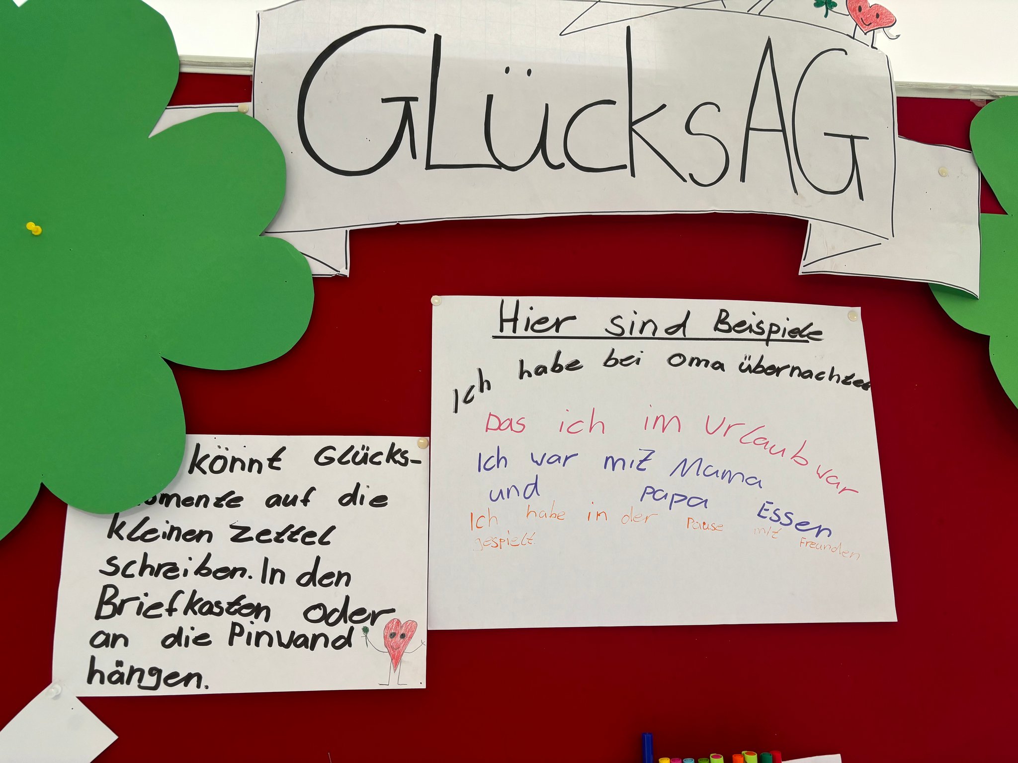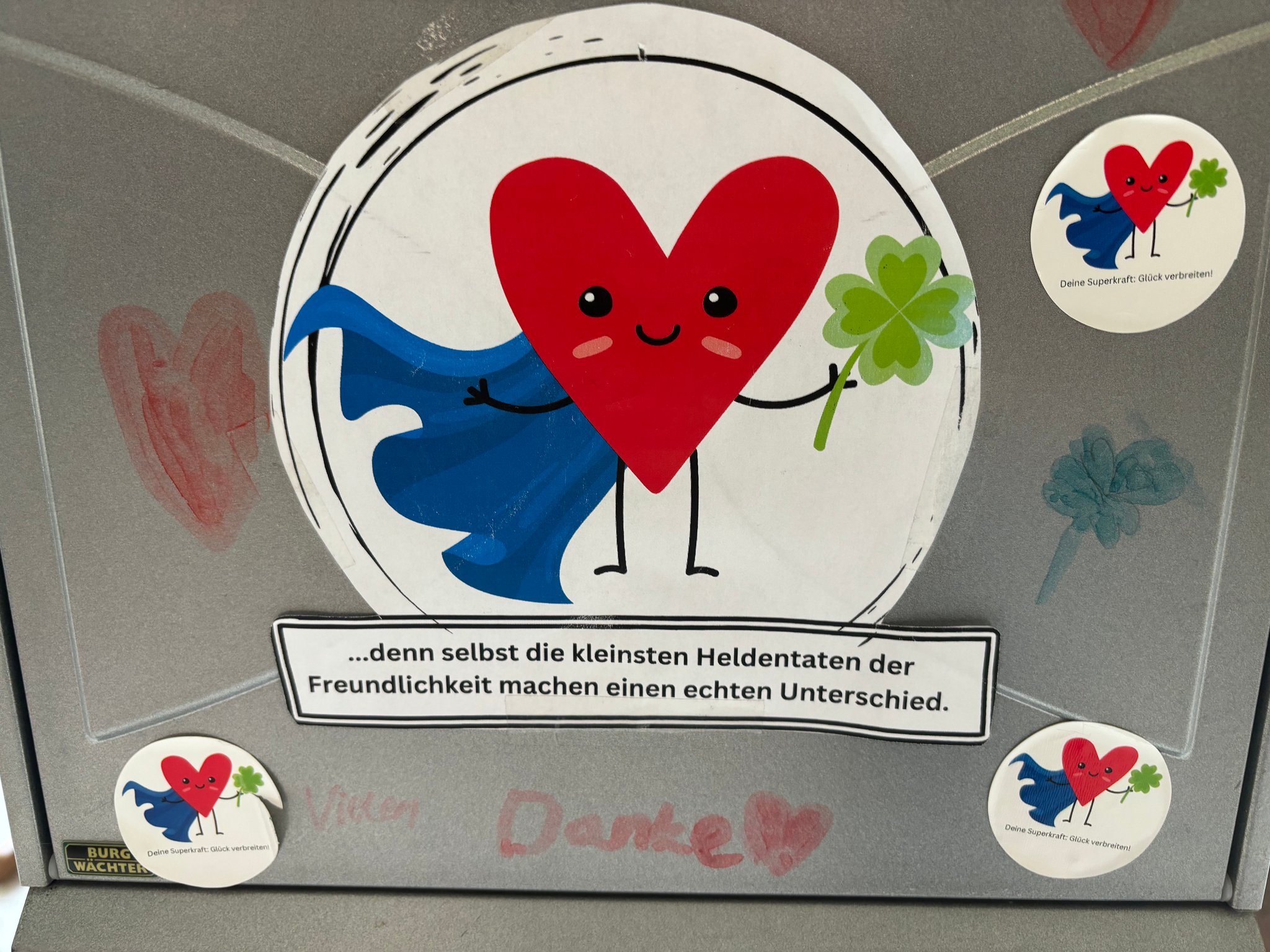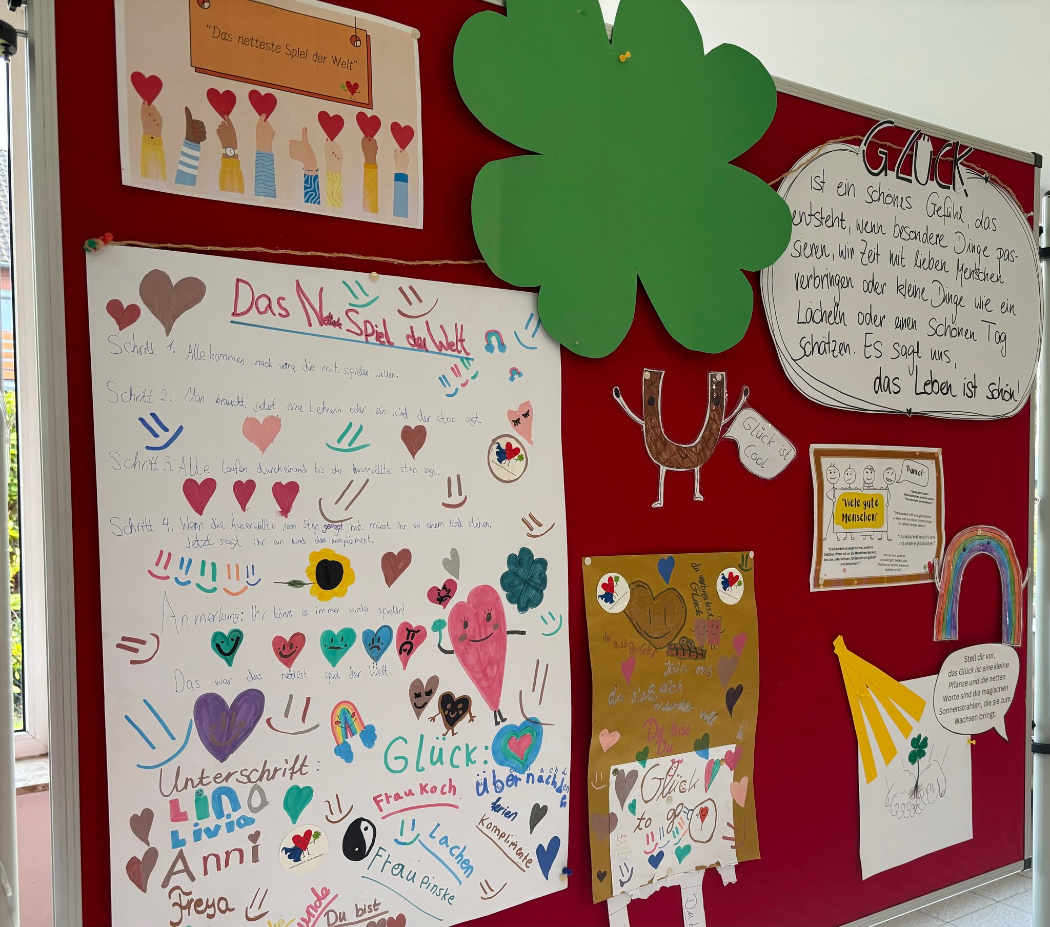 Schon am Montagmorgen wurde unser Schulhof zum Abenteuerland: Überall waren bunte Glückszeichen versteckt – Herzen, Smileys, Kleeblätter und kleine Mutmacher-Sprüche. Wer einen Zettel fand, durfte erzählen, was ihn oder sie glücklich macht. Alle gesammelten Glückszettel wanderten in unsere Schatztruhe und machten sichtbar, wie viele versteckte Glücksmomente uns jeden Tag umgeben. So wurde unser Glücksschatz von Minute zu Minute größer!