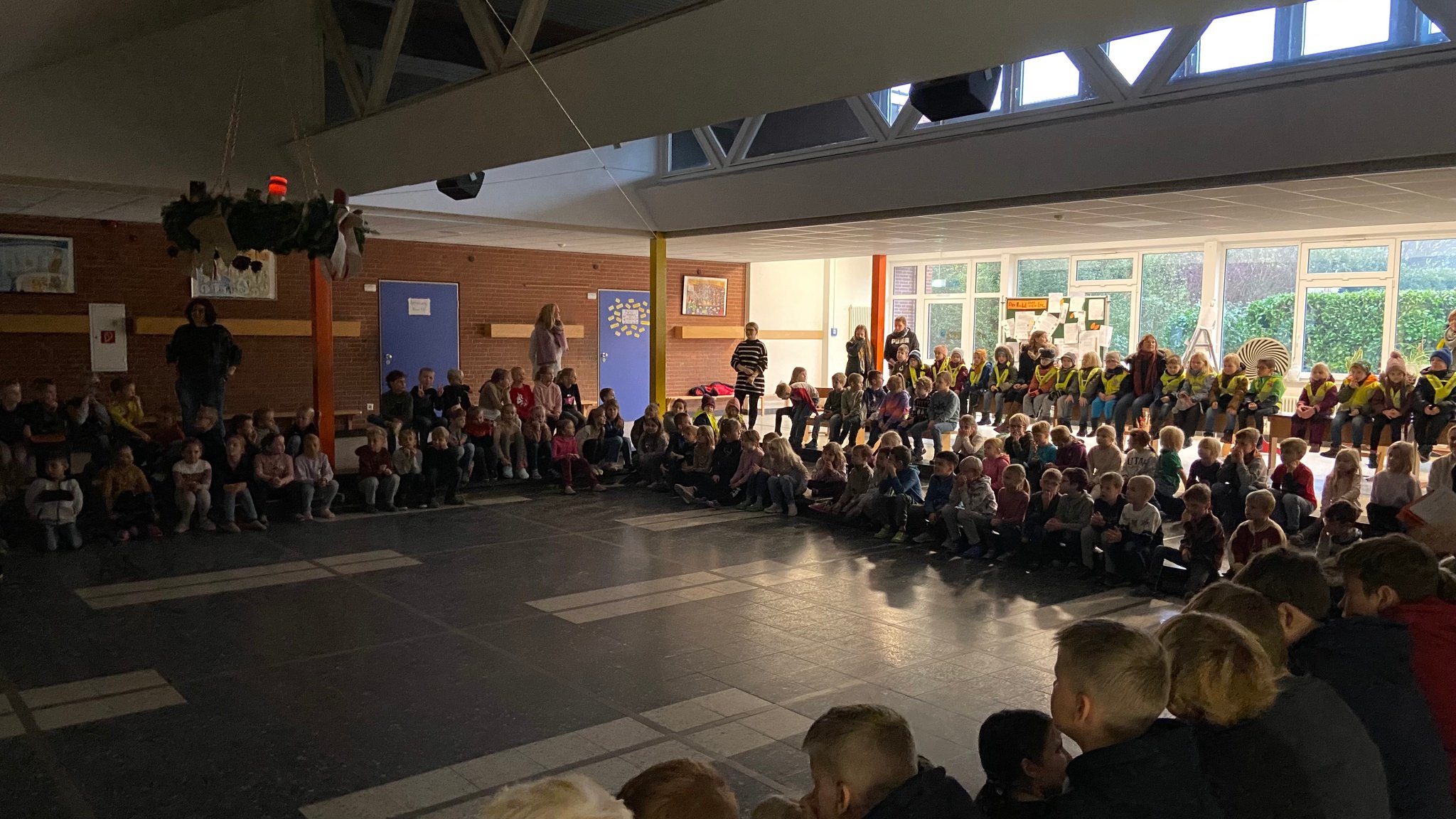 Heute wurde es besinnlich und sehr musikalisch, denn wir haben gemeinsam den 1. Advent "besungen". Nachdem die erste Kerze an unserem schönen Adventskranz zu leuchten begann, stimmten alle Klassen gemeinsam unter der Leitung von Frau Bensmann die ersten Lieder an. Nach anfänglichem Zögern wurde beim dritten Lied dann doch noch kräftig mitgesungen.