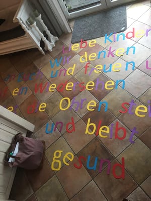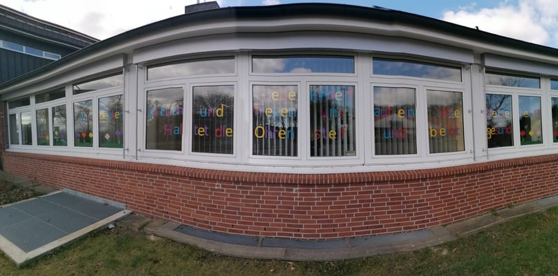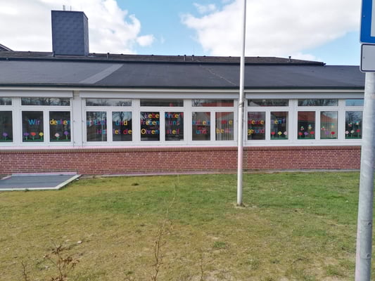 Seit Mittwoch prangt ein buntes Grußwort des Lehrerkollegiums in den Fenstern der Schule. Hier einmal zum Nachlesen! Eine tolle Aktion.