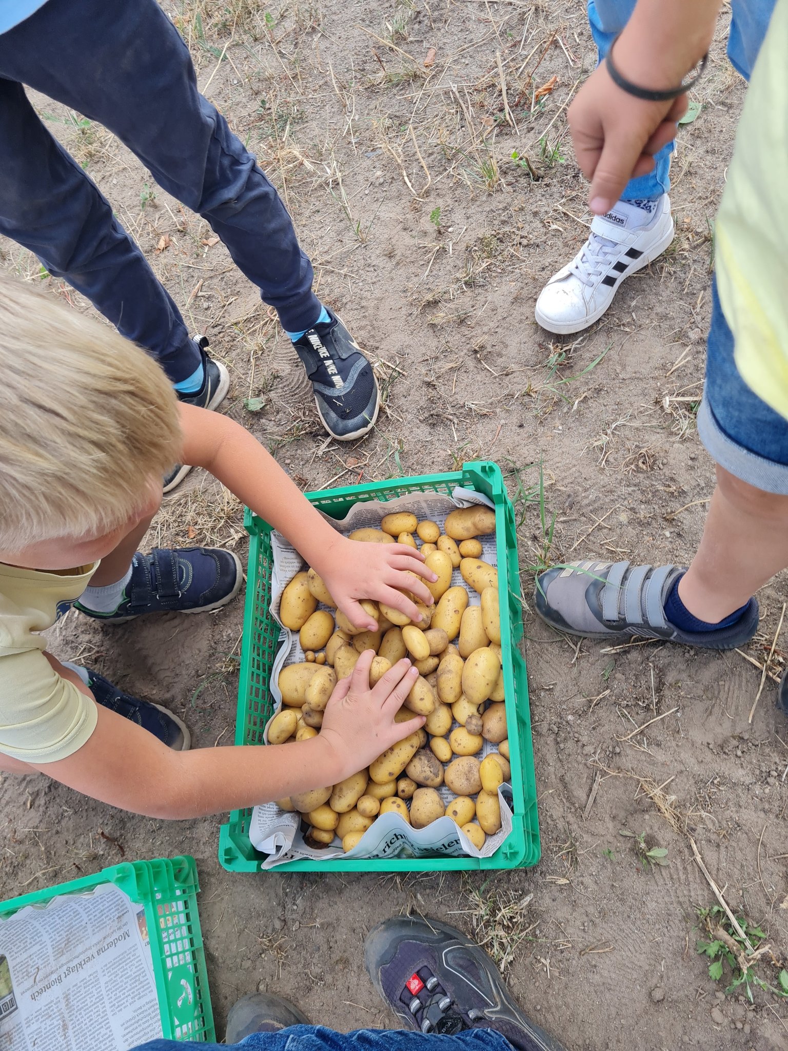 Wir haben unsere Kartoffeln regelmäßig besucht und gegossen. Im Juli/August verwelkten die Pflanzen langsam. Am 30.8. haben wir nachgesehen, ob unter den Pflanzen in der Erde wirklich neue Kartoffeln gewachsen sind. Insgesamt haben wir 120 größere und kleinere Kartoffeln geerntet.
