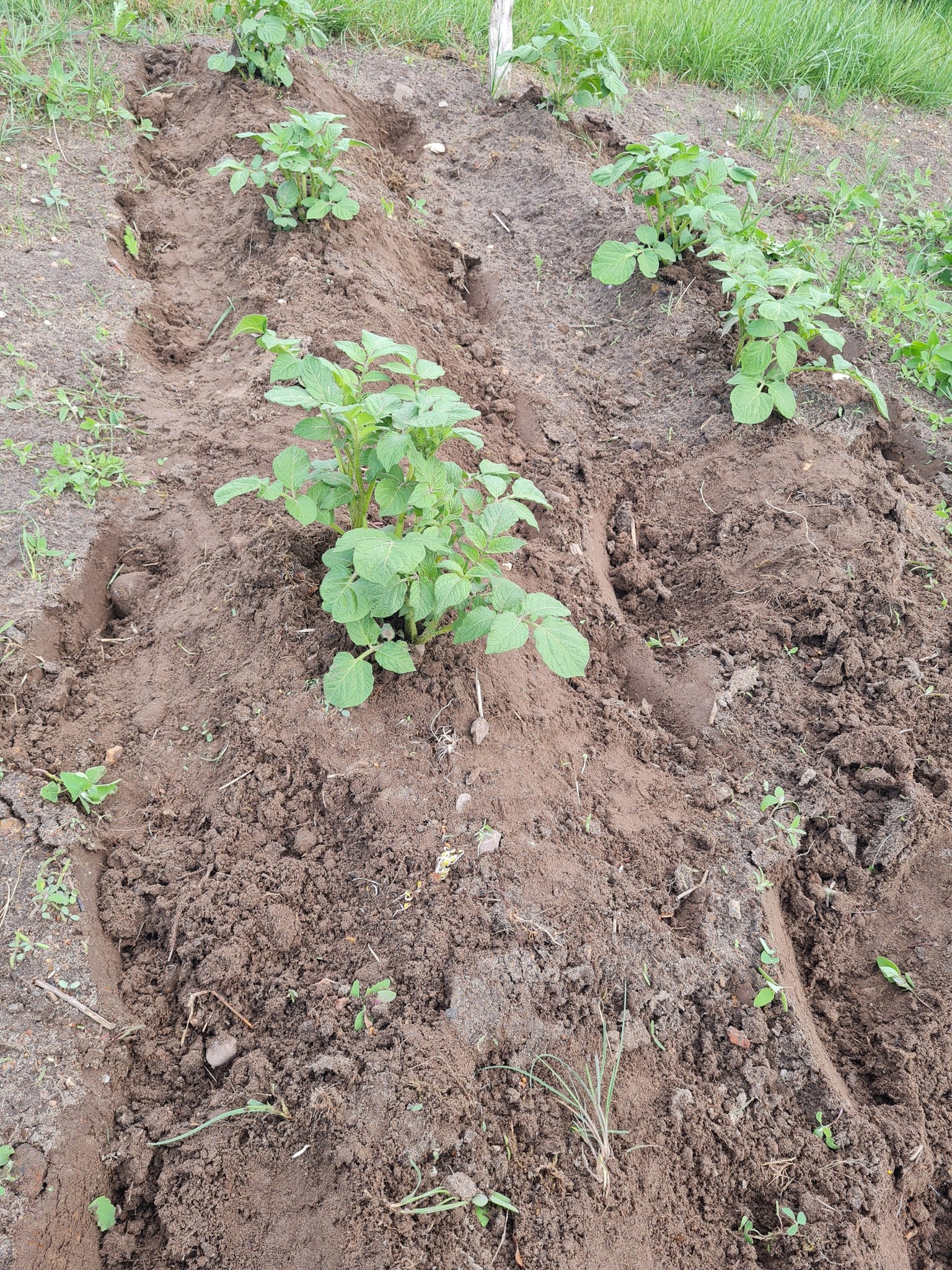 Anfang Mai haben wir 11 gekeimte Kartoffeln in das Beet neben der Blühwiese gepflanzt. Eine Kartoffel haben wir in den dunklen Schrank gelegt. Wir wollten sehen, ob sich aus den gekeimten Kartoffeln etwas entwickeln wird.