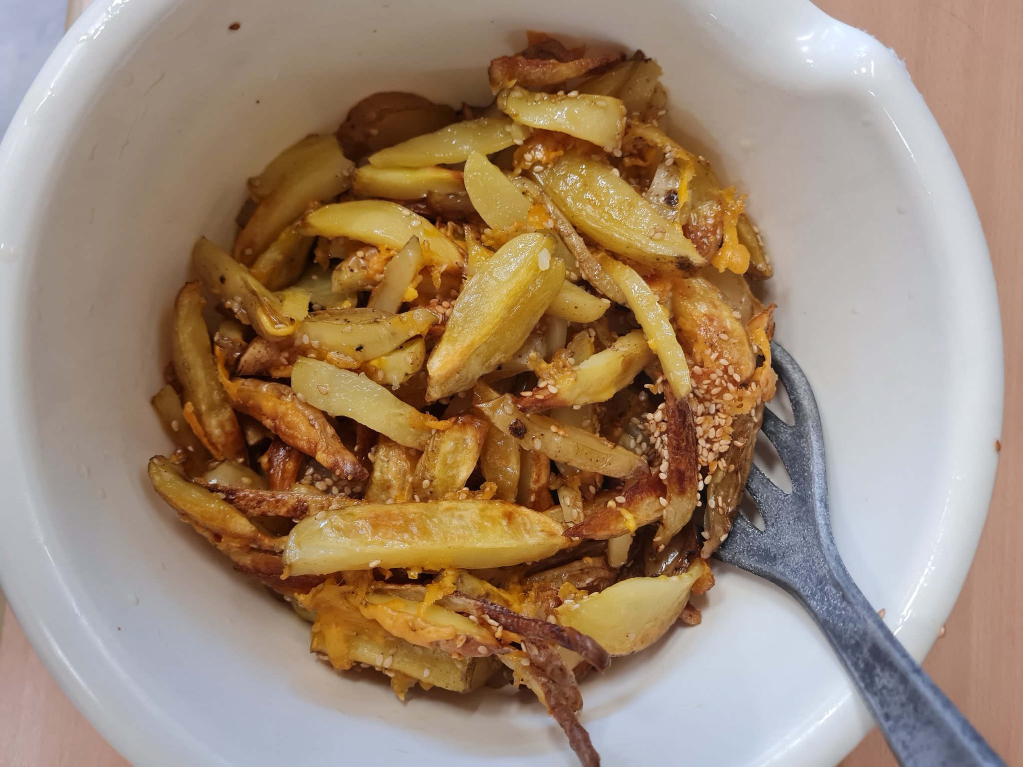 Gesagt, getan: Alle haben beim Schnippeln mitgeholfen. Drei Bleche mit duftenden Sesam-Käse-Pommes konnten verknuspert werden.