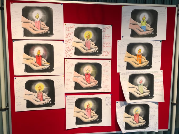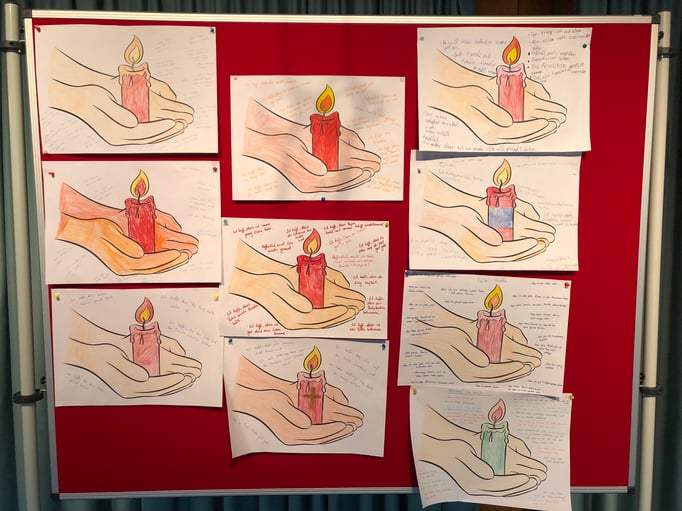 wie sich „Hoffnung sein“ auch im Alltag umsetzen lässt. Diese Hoffnungswünsche und Gedanken nahmen wir mit in die Kirche und jede Klasse bekam ein Hoffnungslicht für die eigene Klasse mit in die