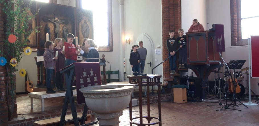 gemeinsam zur Kirche gegangen und als die Glocken läuteten, ging es los. Nach einigen gemeinsamen Liedern, die in den Wochen davor mit den Kindern eingeübt wurden, spielte uns die 4a eine