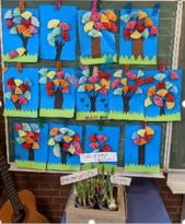 Nun zieht langsam der Frühling ein. Wir lernen das Gedicht „Der Frühling ist ein Maler“, hören Vivaldis Frühlingsmusik über das Padlet und schmücken unseren Klassenraum. Wieder hatte Frau Eichwede eine tolle Idee: Den Kindern gab sie Bastelmaterial mit nach Hause, die Anleitung stellte sie ins Padlet. Das Ergebnis sind knallbunte Frühlingsblütenbäume, die ein Blickfang für jede/n sind, der/die in unser Klassenzimmer schaut.