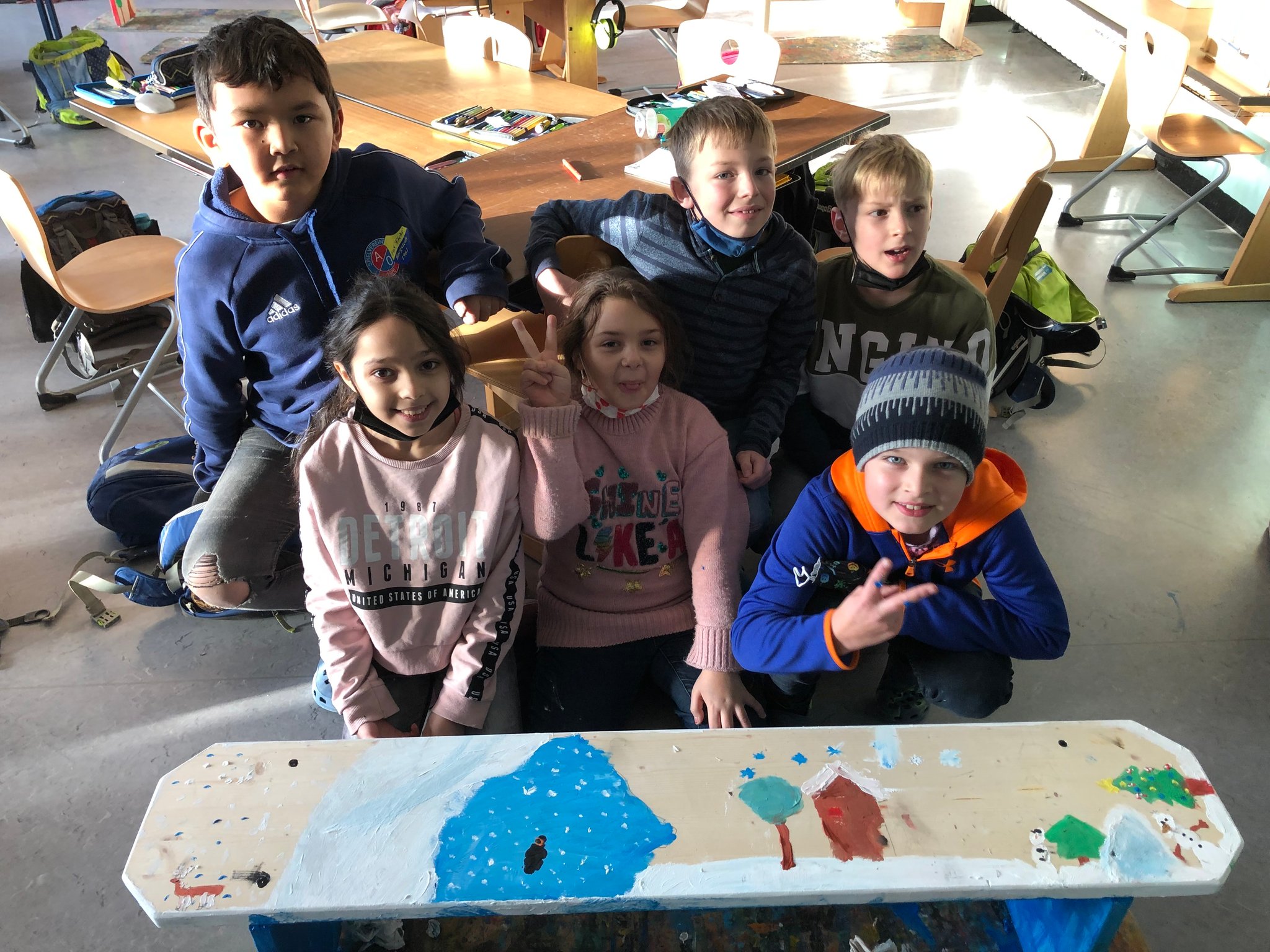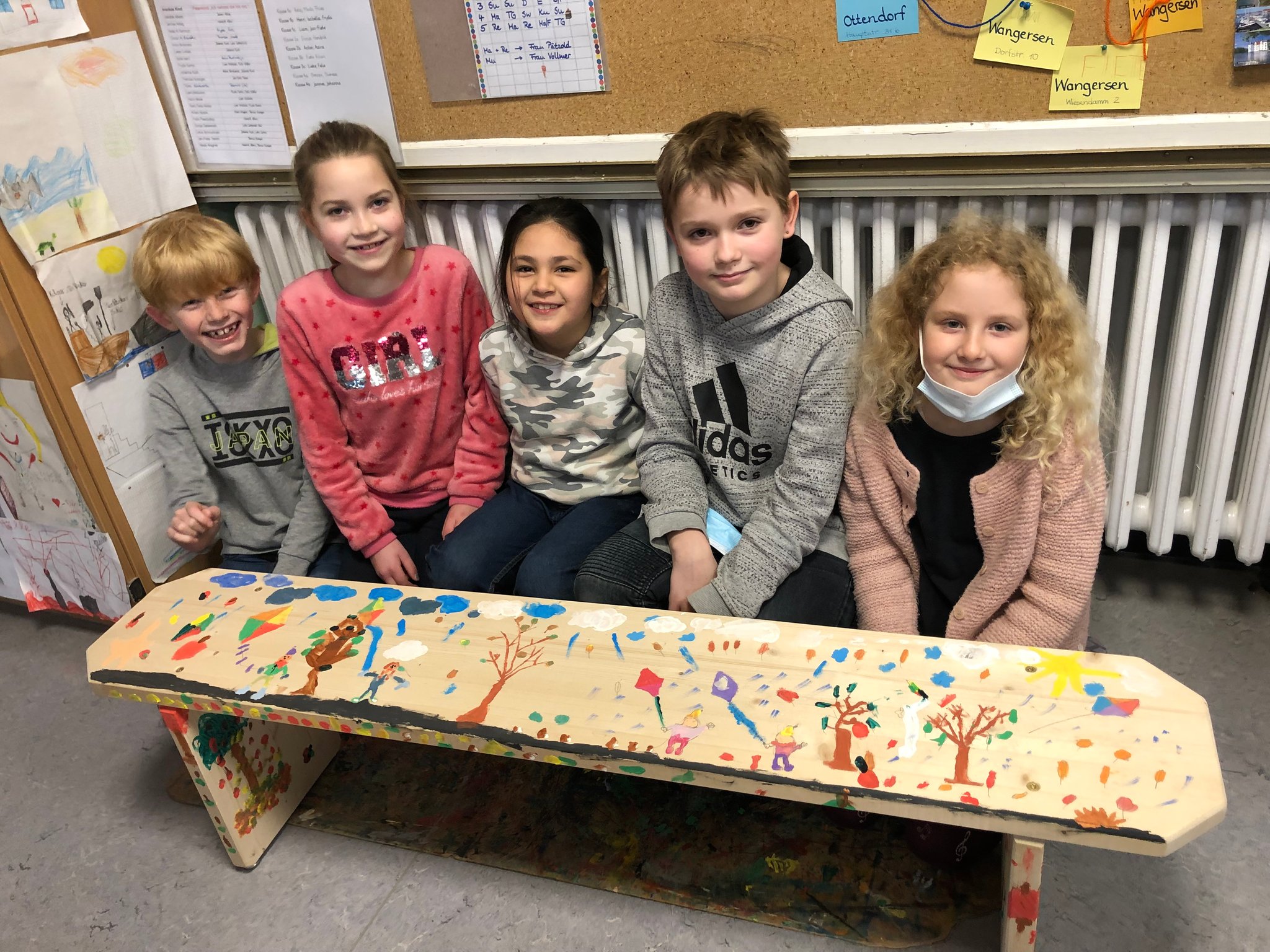 Die Klasse 3a hat ihre Bänke noch jahreszeitlich gestaltet. Nun ist auch klar, welches Kind auf welcher Bank sitzen darf. Hier kommen die Jahreszeitenkinder: