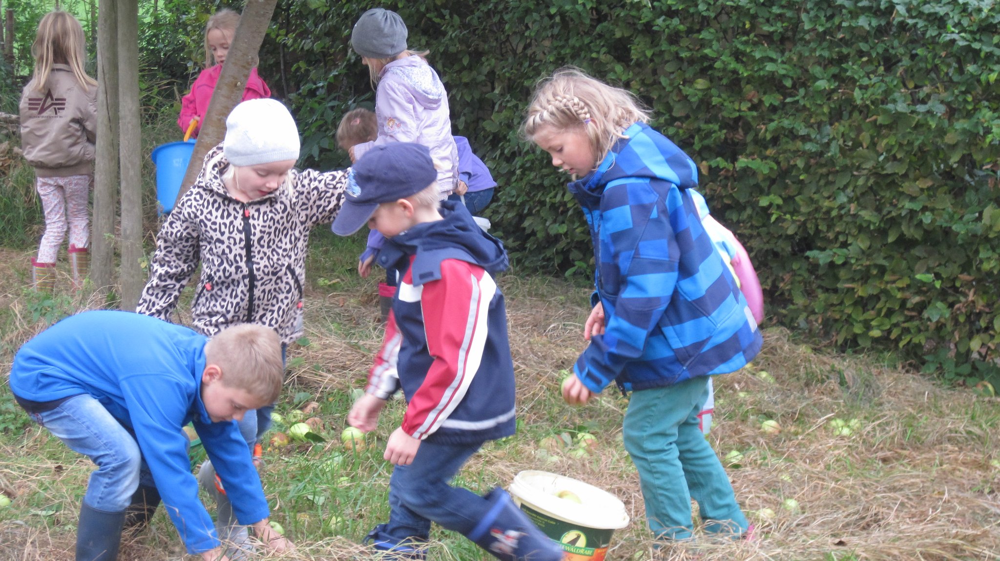 Gestaffelt nach Klassenstufen halfen die Schülerinnen und Schüler zunächst beim Einsammeln der Äpfel auf den verschiedenen Streuobstwiesen im Ort. Mit vereinten Kräften schleppten sie körbeweise Äpfel auf die bereitgestellten Anhänger. Nach getaner Arbeit ging es dann zum Backhaus. Hier schauten alle gespannt den Vorgängen an der mobilen Apfelsaftpresse zu. Eben noch lagen die Äpfel auf dem Anhänger, kurze Zeit später schon wurde der heiße Saft abgefüllt! Selbst die Kinder aus den vierten Klassen, die den Apfeltag ja schon mehrmals erlebten, sind immer wieder fasziniert. Nun machten es sich alle in der guten Stube des Backhauses gemütlich. Auch in diesem Jahr wurde wieder heißer Apfelsaft und leckerer Butterkuchen gereicht. Auch wenn es sehr gemütlich war, musste jede Gruppe dann doch bald wieder zurück zur Schule, denn bereits die nächste Klasse freute sich auf den kleinen Imbiss. Eine tolle Belohnung für den Helfereinsatz der Kinder.