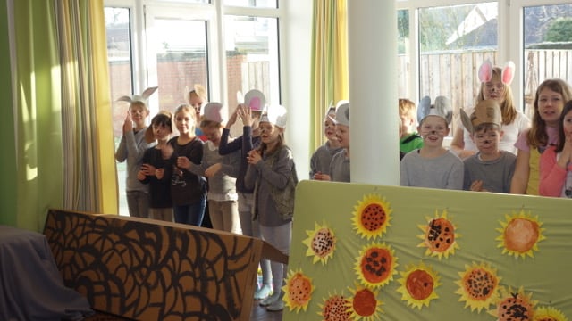 Drei Wochen haben die Kinder der Klasse 2a an dem Stück „Frederick“ von Leo Lionni gearbeitet: Texte gelesen, Rollen verteilt, Requisiten gebastelt, das Bühnenbild gestaltet, Lieder geprobt und Texte gelernt.