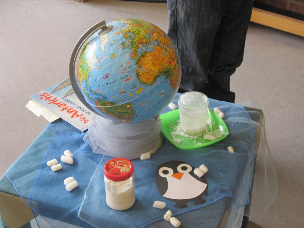 Arktis/Antarktis: Ein Versuch zur „Eisschmelze“ war gerade gezeigt worden. Die Kinder züchten Kristalle und legen ein Forscherbuch an.
