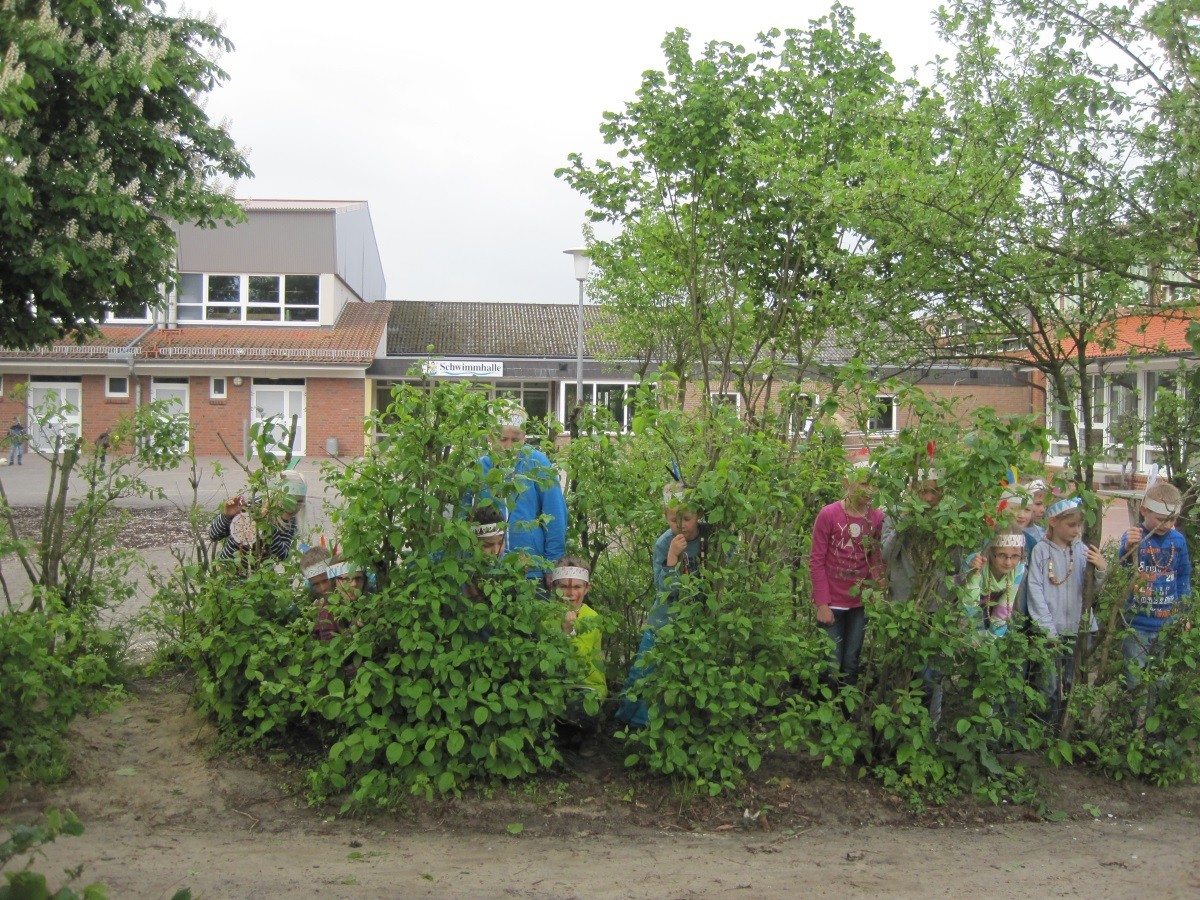 Indianer früher und heute: Wir können einen gebastelten Federkopfschmuck und selbst gemalte Tipis (Indianerzelte) bewundern. Die Kinder erzählen, dass sie „Männer und Jungen auf der Jagd“ gespielt haben.