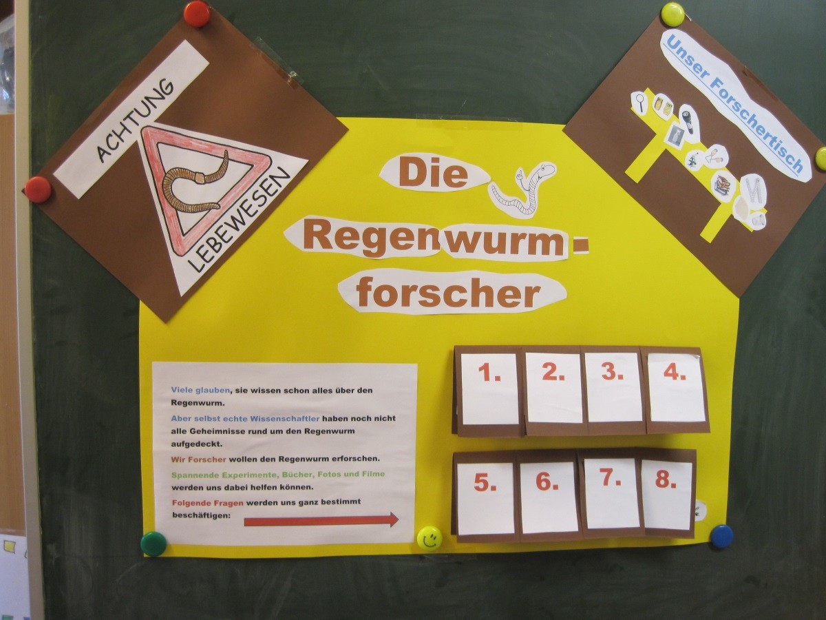 Regenwurmforscher: Die Kinder haben zu zweit einen Regenwurm in Pflege genommen und ihn ganz genau beobachtet und untersucht. Außerdem erfahren sie durch Bücher, Fotos und Filme viel darüber, wie ein Regenwurm lebt.