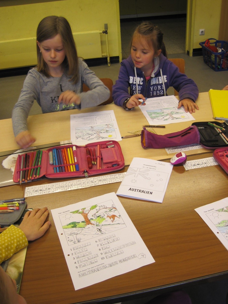 Australien: Die Kinder basteln ein Quartett mit australischen Tieren. Sie lösen Rätsel zum Thema „Australien“ und dürfen ein Didgeridoo ausprobieren. Mehrere Kinder bekommen sogar einen Ton heraus.