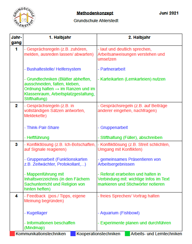 verfügbar zu haben und anzuwenden. In einem Methodenkonzept regelt die Schule verbindlich, welche Methoden in welcher Jahrgangsstufe erworben und geübt werden. Die Entwicklung eines
