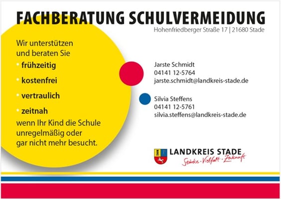 oder gar nicht mehr besucht, wenden Sie sich bitte an den Landkreis Stade. Die Fachberatung Schulvermeidung wird Sie vertraulich und beratend unterstützen.